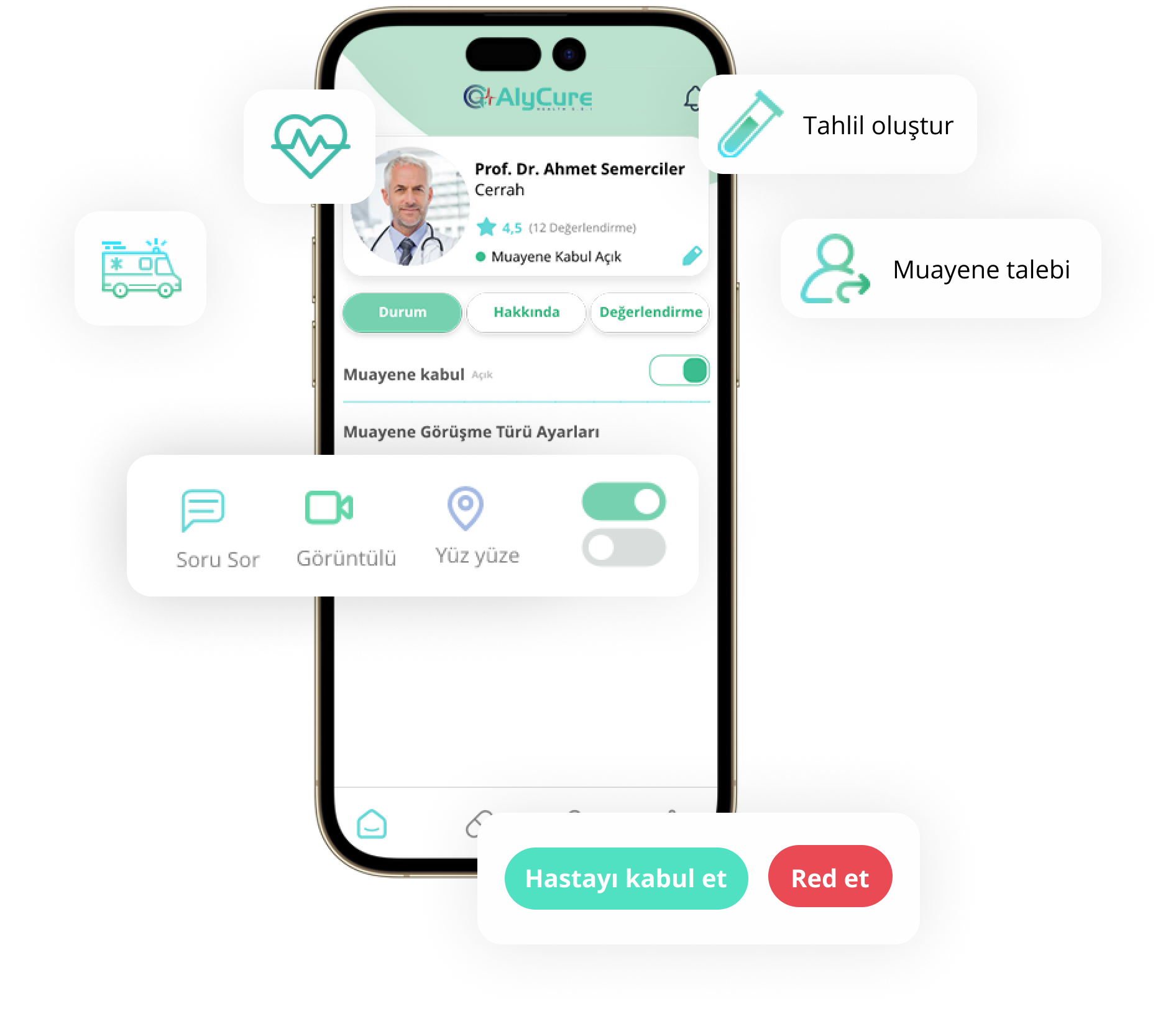 Uygulama üzerinden; Hasta/danışanlarınızla, tercihinize göre online görüntülü ve soru sor şeklinde veya yüz yüze olarak görüşebilir. Radyoloji tetkikleri, laboratuvar tetkikleri,evde bakım hizmetleri ve ambulans hizmeti sağlar
